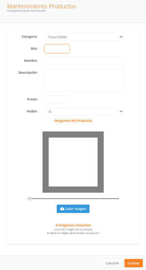 - Te Permite agregar hasta 4 fotos por producto, SKU (clave de producto), nombre del producto, descripción y su precio.